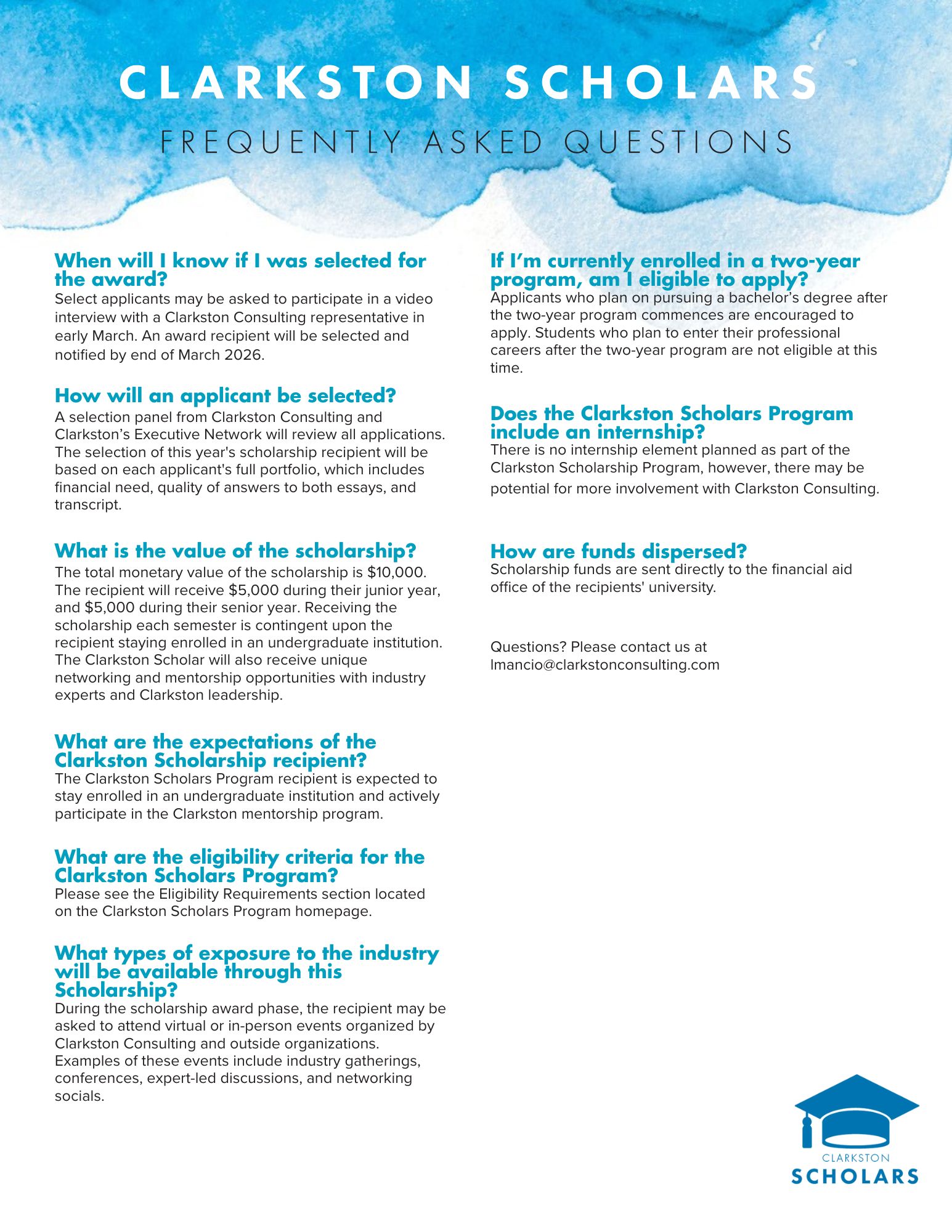 We are currently accepting applications for the 2026 Clarkston Scholars Program. The deadline to apply is February 6, 2026. Visit the application link below.