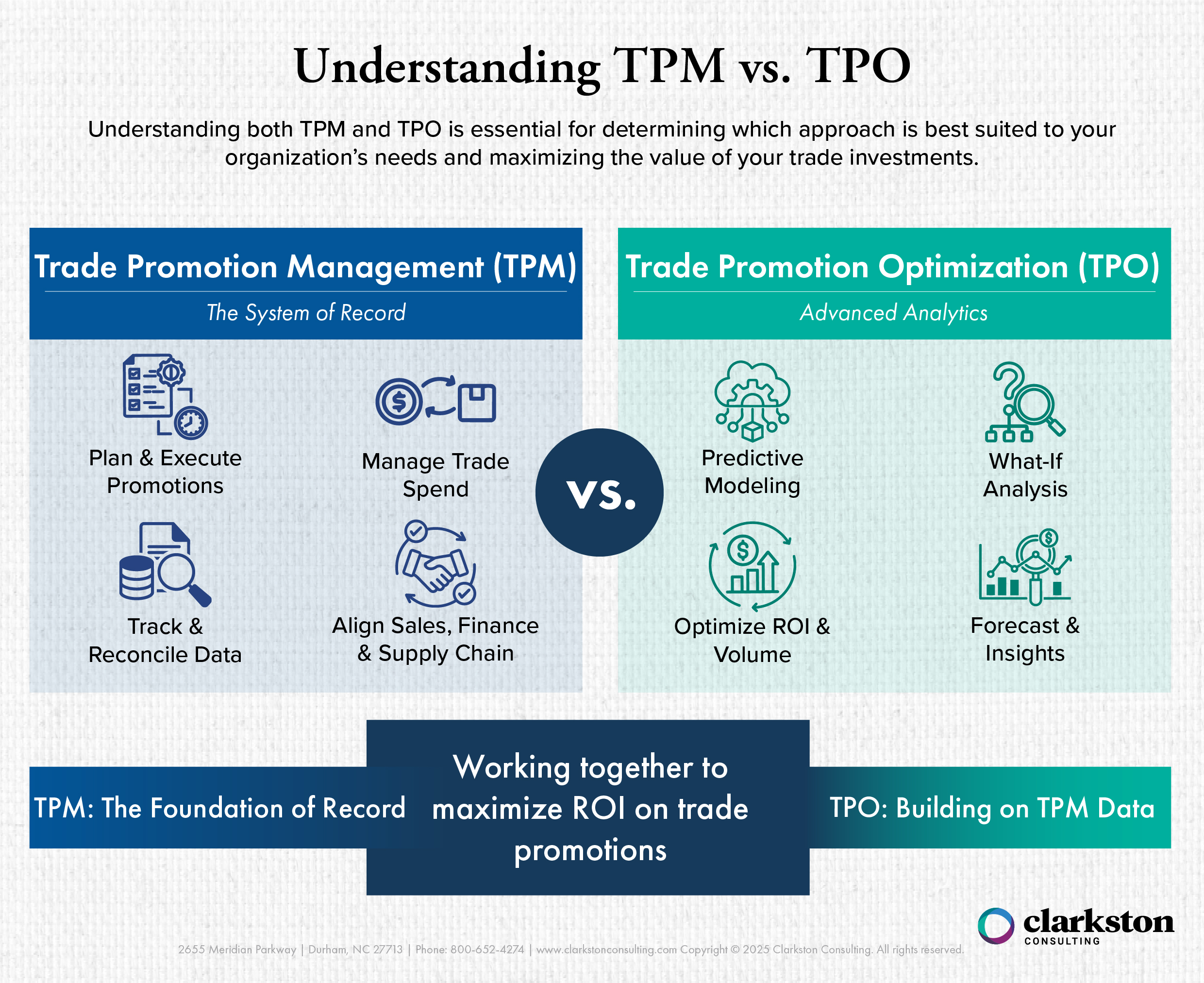 Understanding how TPM and TPO work together is critical to maximizing the return on trade investments. While TPM and TPO are closely related, they serve distinct purposes within an organization. TPM acts as a record system, while TPO builds on the foundation of TPM to optimize promotion decisions. Understanding the differences between these two platforms and how to use and implement each is the key to maximizing ROI on promotional investments.